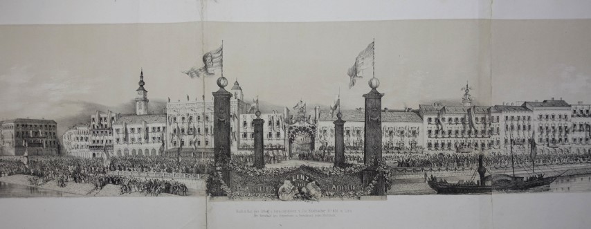 Nebehay-W. 155 / 1, 2, 3.- Sehr selten.- Brautfahrt der Kaiserin Elisabeth auf der Donau mit Halt am 21. April 1854 in Linz; mit Empfang seiner Braut, Herzogin Elisabeth in Bayern, durch Kaiser Franz Joseph I. von Österreich an der Donaulände.- Franz Joseph Edlbacher, auch Edelbacher (* 27. Jänner 1817 in Grünburg; 4. April 1868 in Linz) war Beamter des Stadt- und Landrechtes. In seiner Freizeit schuf er eine große Anzahl vornehmlich von Veduten und Panoramen von Linz u. Umgebung.- (Oberösterreich, Monarchie, Habsburger) |