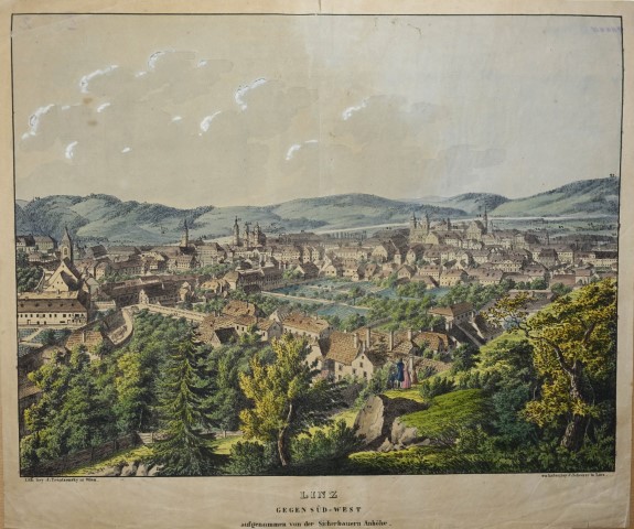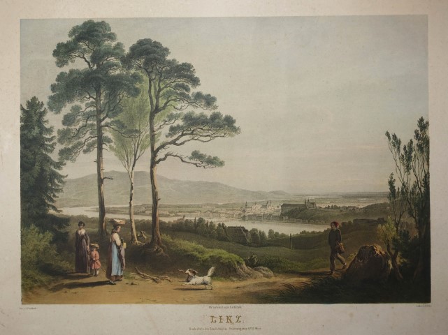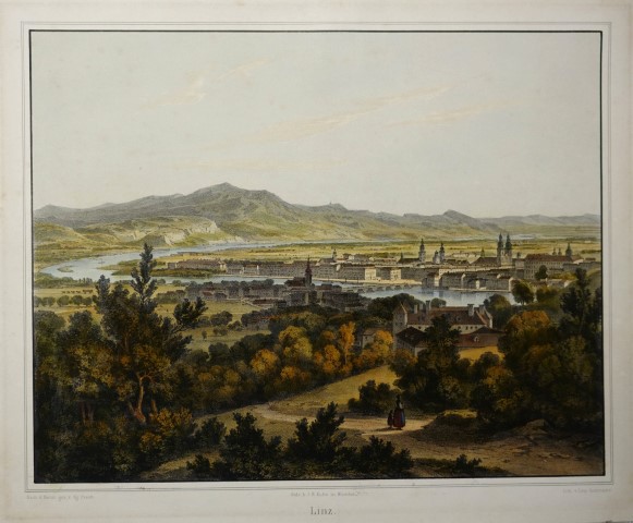 Seltene, großformatige Ansicht.- Blick vom Pöstlingberg über die Donau auf die Stadt Linz, Bildtitel in Golddruck.- Karl Ludwig Libay (* 13. Mai 1814 in Neusohl, 16. Jänner 1888 in Wien) studierte ab 1834 an der Wiener Akademie in der historischen Zeichenklasse von K. Gsellhofer, Johann M. Ender und Leopold Kupelwieser, sowie in der Landschaftsklasse von J. Mößmer. Seit 1841 widmete er sich der Landschaftsmalerei und suchte auf seinen Wanderungen zunächst rund um Wien die Motive, doch von 1844 an reiste er bereits oft nach Salzburg und seine Umgebung. 1848 arbeitete er erstmals in Ischl.- Ränder gering braunfleckig. (Oberösterreich) |