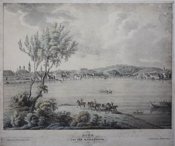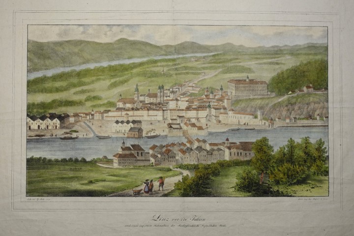 Überaus seltene, großformatige Ansicht (kein Exemplar in einer öffentl. Sammlung nachweisbar).- Blick von Urfahr über die Donau mit hölzerner Brücke.- Der Maler und Zeichner Joseph Löw (*14. April 1770 in Linz; 26. Oktober 1842 in Steyr) war von 1809-25 Zeichenlehrer an der Normalschule in Linz u. ab 1830 "Mal- und Zeichenmeister in der k. k. Kreishauptschule" in Steyr. Er war Mitarbeiter an der "Kirchlichen Topographie" und Mandatar im Traunkreis des Vereins zur Bildung eines vaterländischen Museums für Österreich ob der Enns und Salzburg. Er zeichnete Ansichten von wichtigen Ereignissen, von den Städten Linz u. Steyr, von Christkindl, Losenstein, dem Kefermarkter Altar, dem Traunfall usw.- Tls. leicht gebräunt, rechte untere Ecke ergänzt, wenige kl. Randläsuren, kl. Quetschfalte beim Bildtitel. (Oberösterreich) |