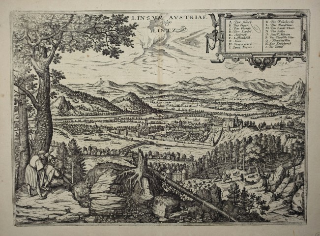 Nebehay-W. 108, 5.Bd. 52 - Fauser 7816 - J. Schmidt, Linz in alten Ansichten Nr. 12, Tafel 3.- Älteste gedruckte Ortsansicht ! Blick von Norden über die Donau auf die Stadt.-Das monumentale Werk "Civitates Orbis Terrarum" war das umfangreichste und bedeutendste Städtebuch des 16. Jahrhunderts. Es revolutionierte die zeitgenössische Kartographie und Buchkunst und gilt als wichtiges kulturhistorisches Dokument seiner Zeit.- Gutes, breitrandiges Exemplar, verso mit lat. Text. (Oberösterreich) |