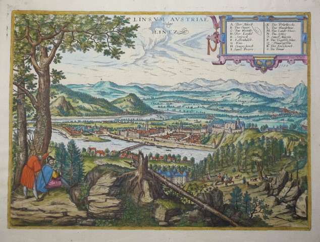 Linsum Austriae vulgo Lintz. Altkolorierter Kupferstich v. Georg Hoefnagel nach Lucas van Valckenborch aus Braun u. Hogenberg "Civitates Orbis Terrarum” Köln 1594, 36 x 50 cmNebehay-W. 108, 5.Bd. 52 - Fauser 7816 - J. Schmidt, Linz in alten Ansichten Nr. 12, Tafel 3.- Älteste gedruckte Ortsansicht ! Blick von Norden über die Donau auf die Stadt.- Das monumentale Werk "Civitates Orbis Terrarum" war das umfangreichste und bedeutendste Städtebuch des 16. Jahrhunderts. Es revolutionierte die zeitgenössische Kartographie und Buchkunst und gilt als wichtiges kulturhistorisches Dokument seiner Zeit.- Sehr schönes Exemplar, kräftiges Kolorit. (Oberösterreich) |