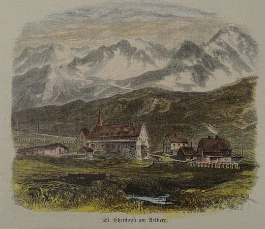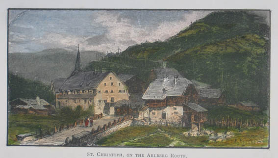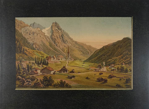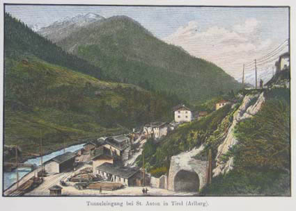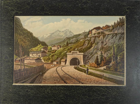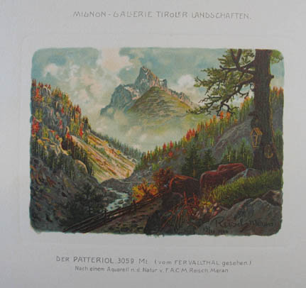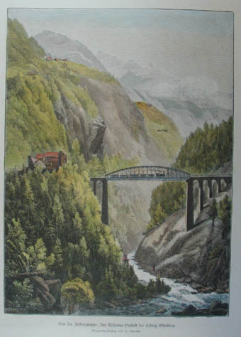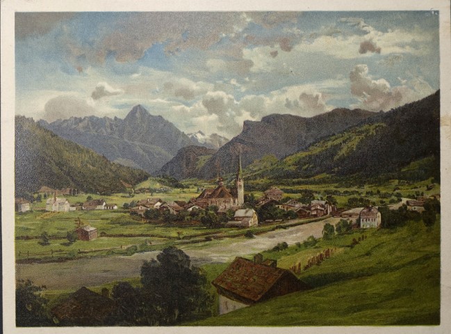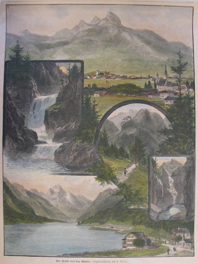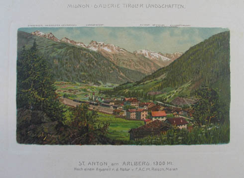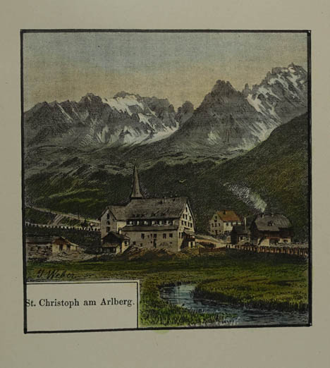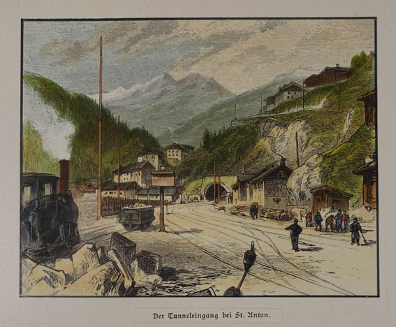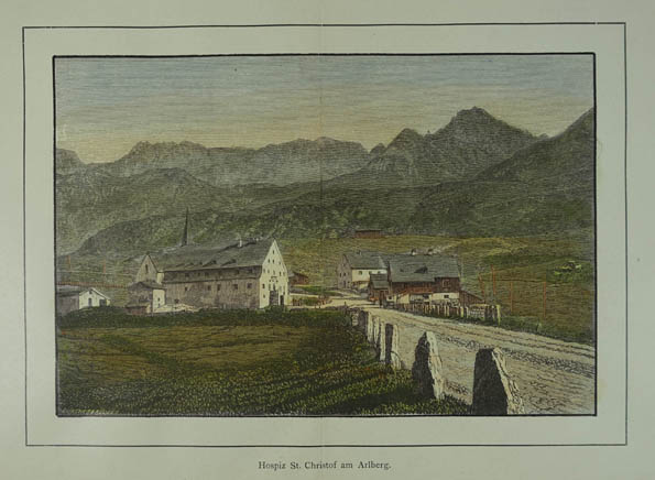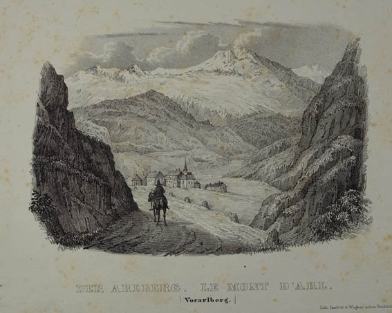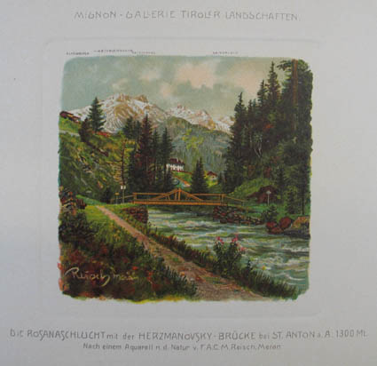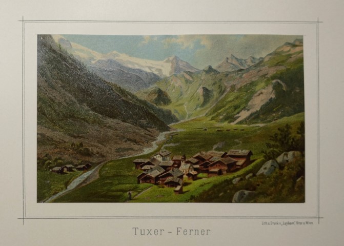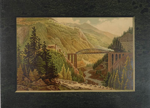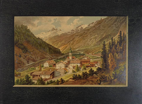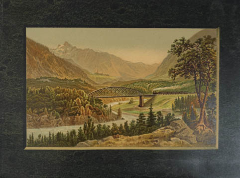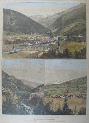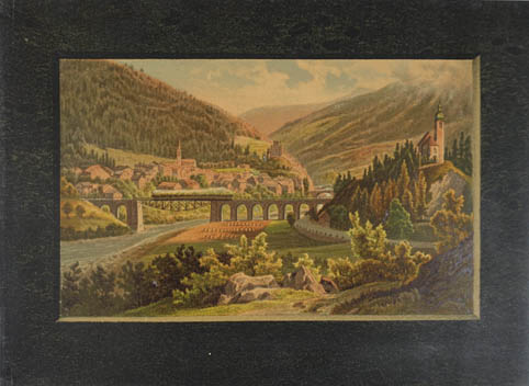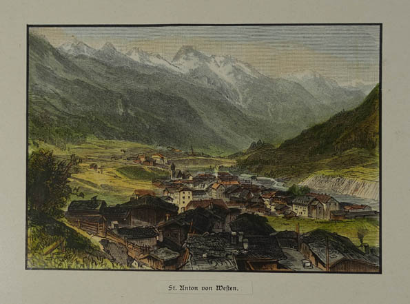 Flirsch. Chromolithographie nach einem Aquarell von Ferdinand Gatt, aus "Arlberg-Album” Wien 1886, 10 x 16 cmNebehay-W. 7 / 9.- Arlbergbahn.- Blick von einem erhöhten Standpunkt auf Flirsch im Stanzertal, in den Bergen zwischen Landeck und dem Arlbergpass gelegen.- Verso mit Titelschild (Stanzertal, Eisenbahn, Tyrol, Tirol) |