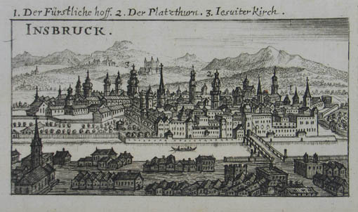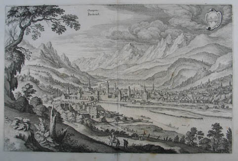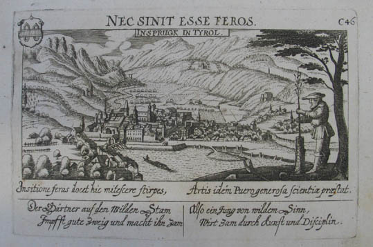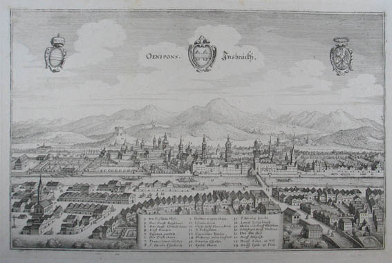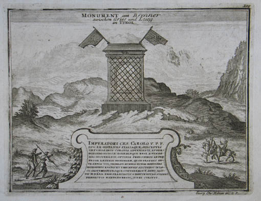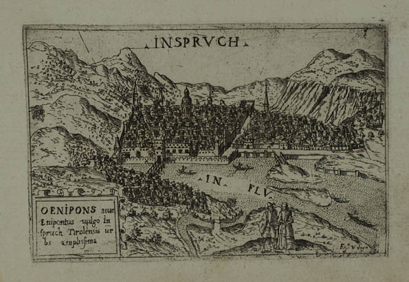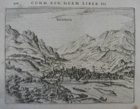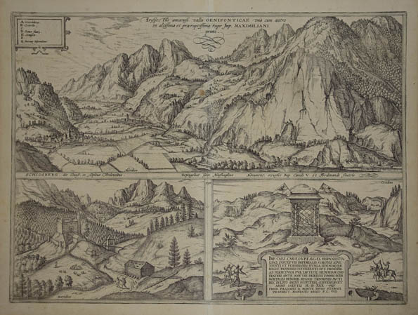 Prospectus amoeniss vallis Oeniponticae...; Schlosberg, die Clause, in Alpibus Tirolensibus; Monument occursus Imp. Caroli V. et Ferdinandi fratris. Kupferstich aus Braun u. Hogenberg "Civitates Orbis Terrarum" Köln 1590, 36 x 52 cmNebehay-W 108, 5. Bd. 59.- 3 Ansichten auf einer Tafel: Oben: Inntal oberhalb Innsbruck mit Zirl, Kematen u. Martinswand; Links unten: Klause und Schloßberg bei Reutte; Rechts unten: Monument bei Steinach am Brenner.- Das monumentale Werk "Civitates Orbis Terrarum" war das umfangreichste und bedeutendste Städtebuch des 16. Jahrhunderts. Es revolutionierte die zeitgenössische Kartographie und Buchkunst und gilt als wichtiges kulturhistorisches Dokument seiner Zeit.- (Tyrol, Tirol) |