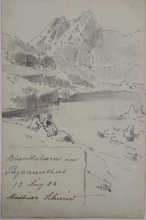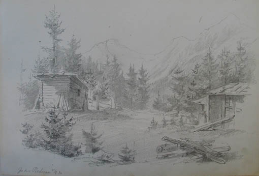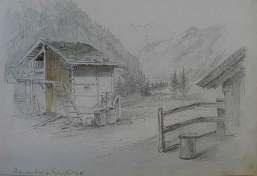 Pletzacher Alm im Achenthal. Anonyme Bleistiftzeichnung leicht aquarelliert. Links unten mit Bleistift bezeichnet u. datiert 3. 9. (18)74, 17,5 x 25,5 cm (Blattgr.)(Tyrol, Tirol, Künstlergrafik) |