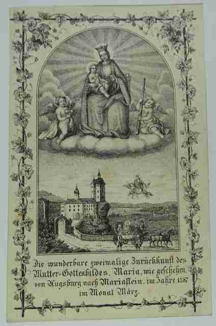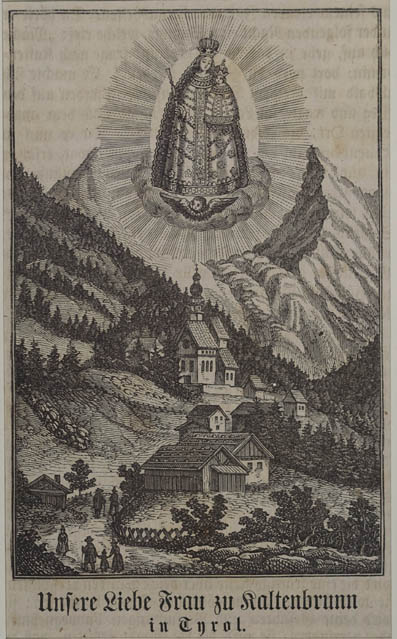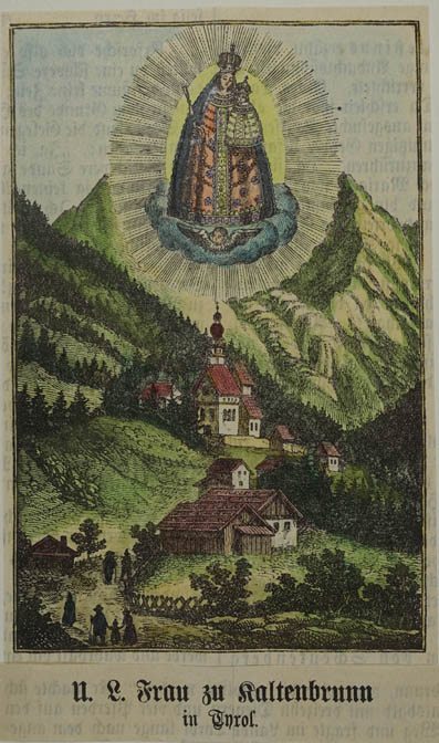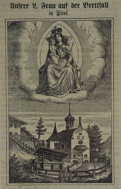 Unsere L. Frau auf der Brettfall in Tirol. Holzstich um 1870, 13,5 x 8,5 cm(Andachtsbild, Wallfahrtsbild, Tyrol, Tirol) |