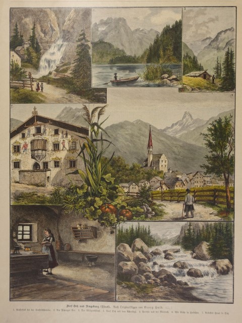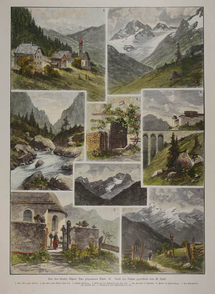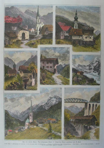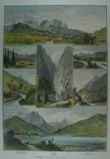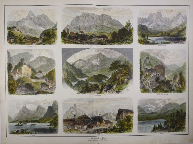 Großformatiger Holzstich mit 9 Ansichten (10 x 14 bis 10 x 20 cm): Sonnenspitze bei Lermoos; Lermoos; Seebensee bei Leermos; Fernstein von der neuen straße; Auf dem Fernpaß; Fernstein von der alten Straße; Weißensee; Bieberwier; Blindsee.- Max Kuhn (1838-1888) war Maler und Lithograf. Er malte überwiegend Landschaften und Architektur. (Tyrol, Tirol) |