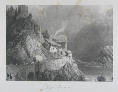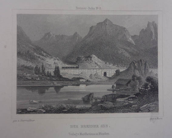 Die Brenner Passhöhe 3500 par°. Ursprung der Eisack und Wasserscheide des Schwarzen u. Adriatischen Meeres. Stahlstich v. Kurz nach Obermüllner aus "Die Brenner-Bahn” München um 1867, 7,5 x 11 cmNebehay-W. 457 / 9.- Ohne gedruckten Bildtitel.- Die Brennerbahn (italienisch Ferrovia del Brennero) wurde von 1864 bis 1867 nach Plänen und unter der Leitung von Karl Etzel von der k.k. priv. Süd bahn ge sell schaft als Teil der Verbindung von Kufstein nach Ala (und weiter in Richtung Verona) gebaut (Wipptal, Eisenbahn, Tyrol, Tirol) |