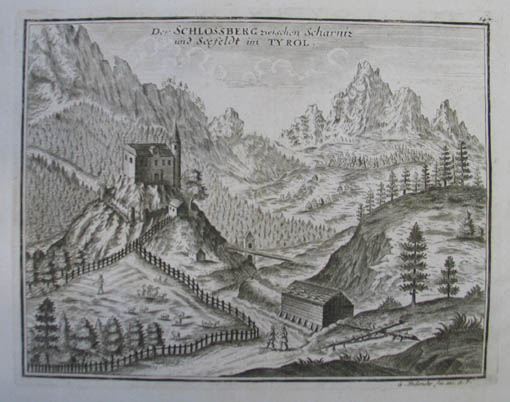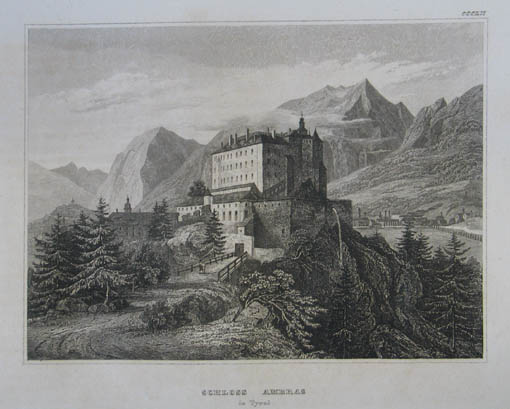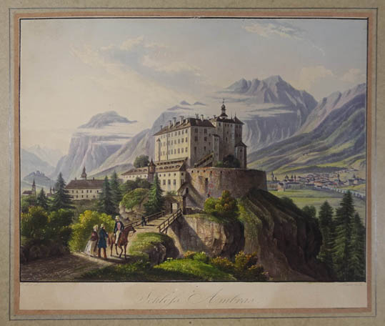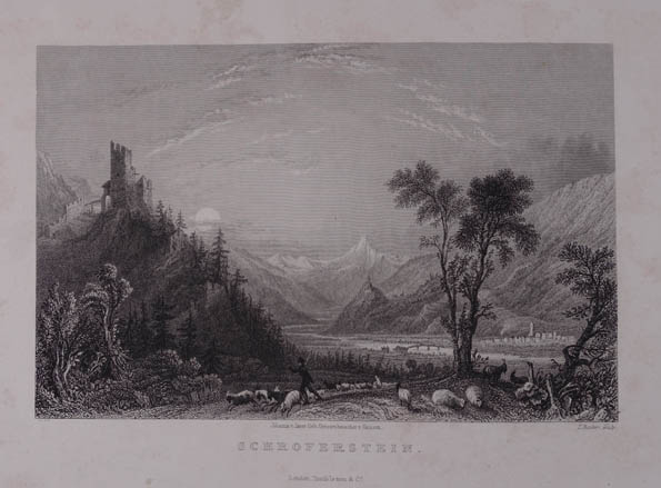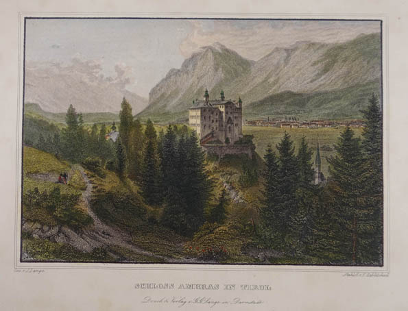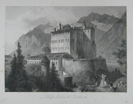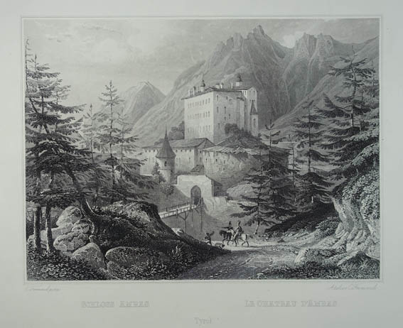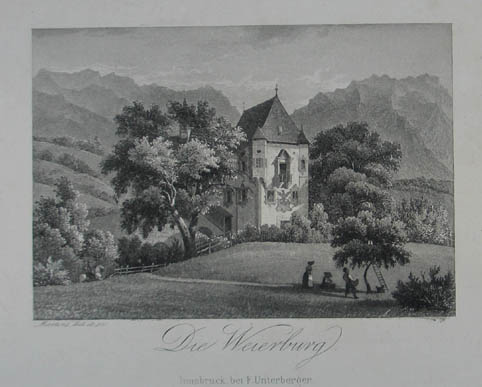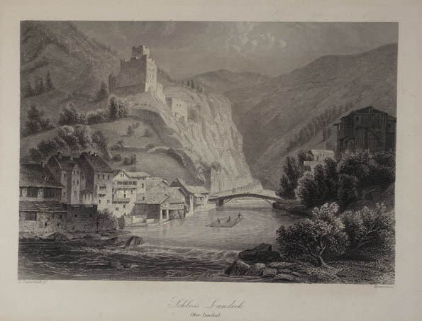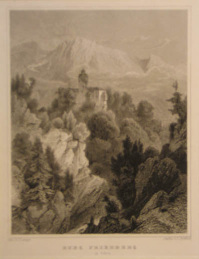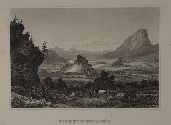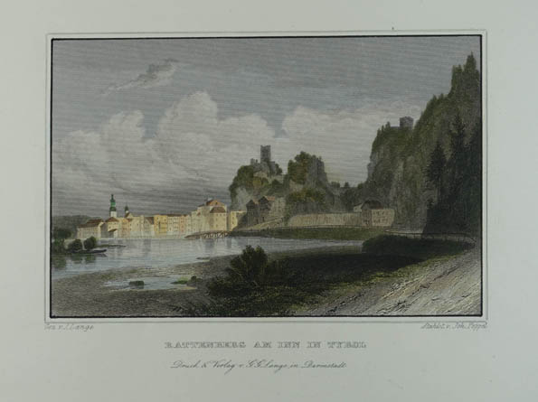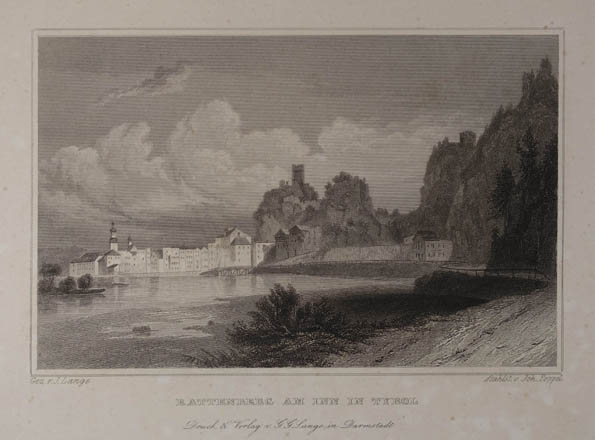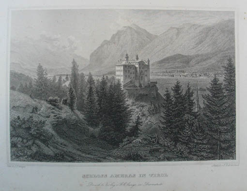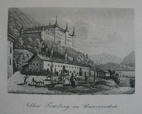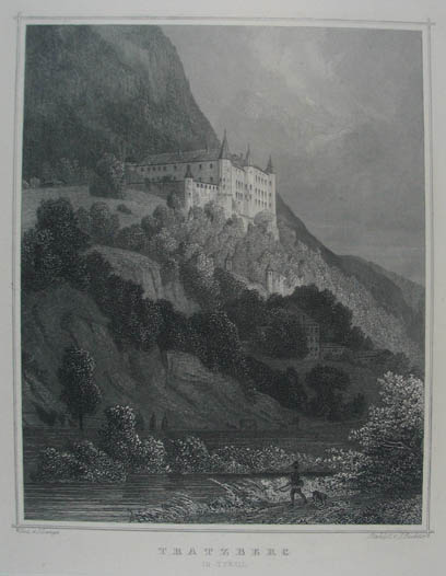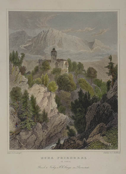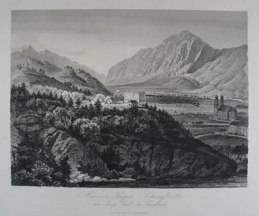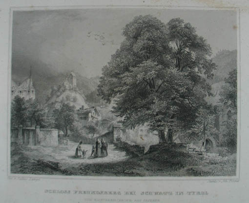 Schloss Freundsberg bei Schwatz in Tyrol vom Klosterkirchhofe aus gesehen. Stahlstich v. Poppel n. Lange aus Schimmer "Das Kaiserthum Oesterreich” Darmstadt 1842, 10 x 14 cmNebehay-W. 635, 2.Bd. 35. - Im Randbereich leicht stockfleckig. (Unterinntal, Tyrol, Tirol) |