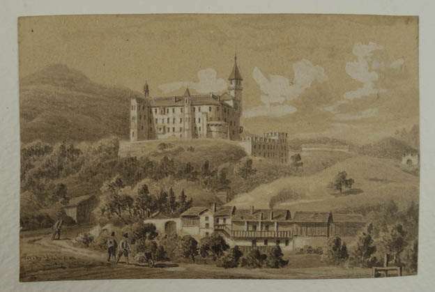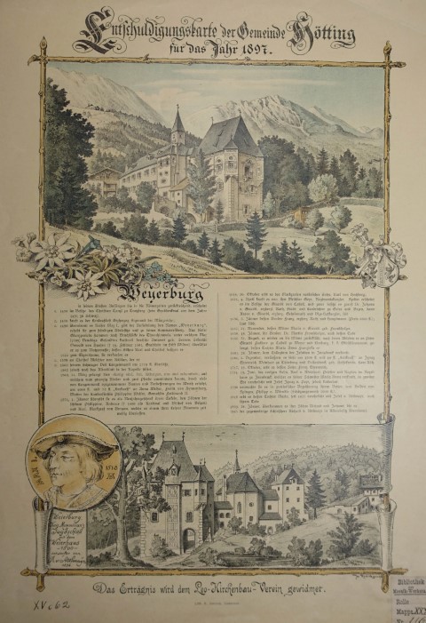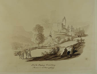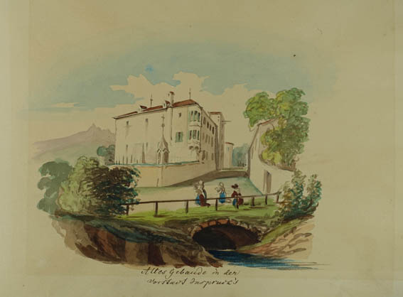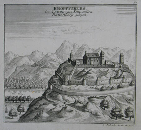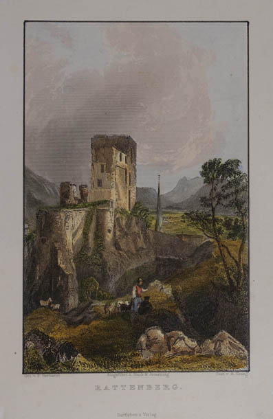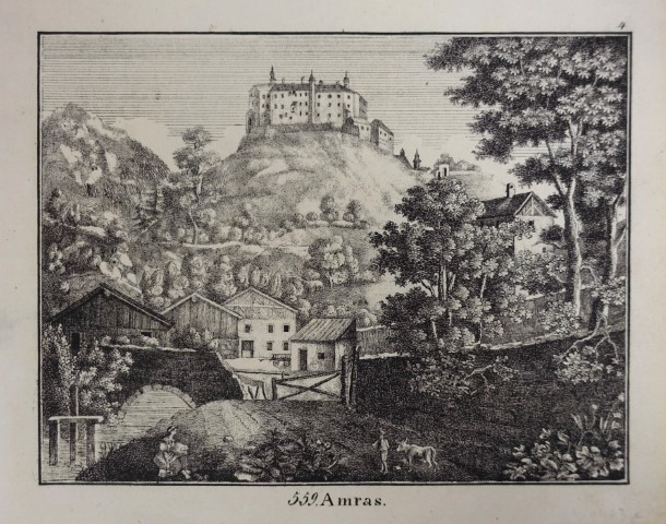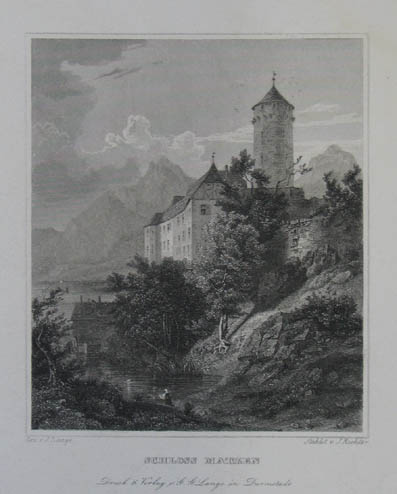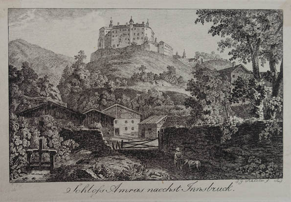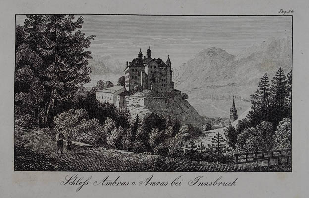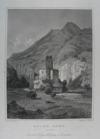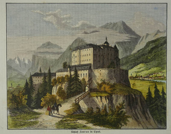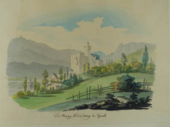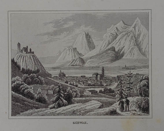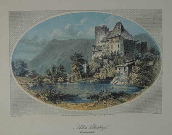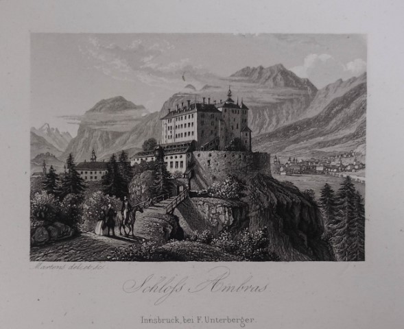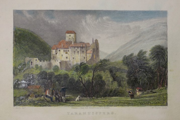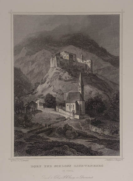 Schloss Freundsberg bei Schwatz in Tyrol vom Klosterkirchhofe aus gesehen. Stahlstich v. Poppel n. Lange aus Schimmer "Das Kaiserthum Oesterreich” Darmstadt 1842, 10 x 14 cmNebehay-W. 635, 2.Bd. 35. - Im Randbereich leicht stockfleckig. (Unterinntal, Tyrol, Tirol) |