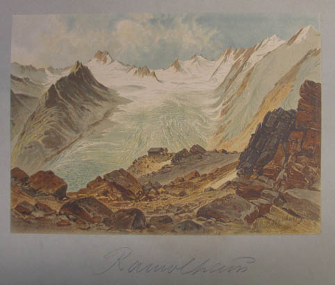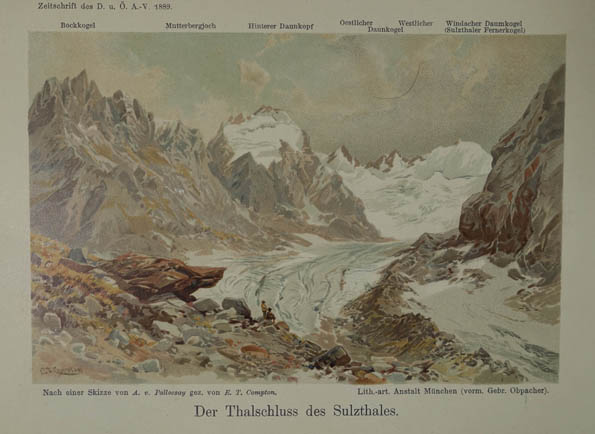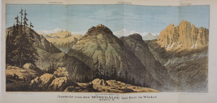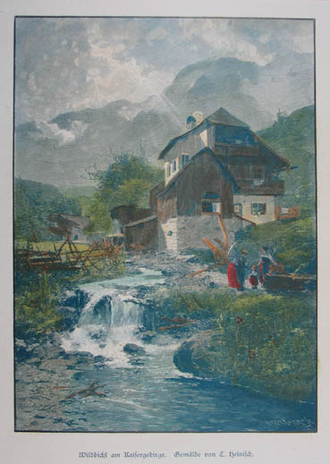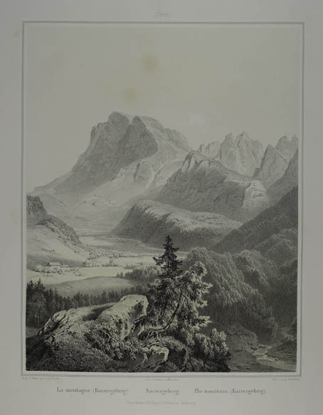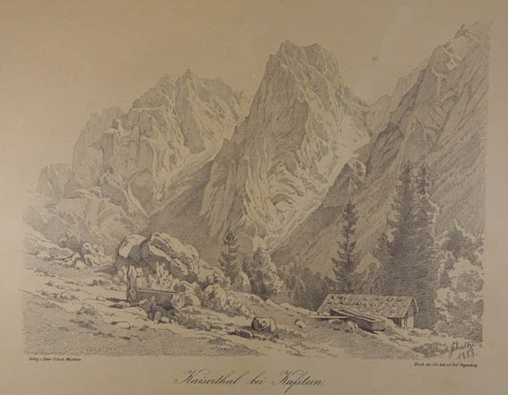 Kaiserthal bei Kufstein. Lithographie von Max Schultze aus "Alpines Skizzenbuch. Ansichten aus den Deutschen und Österreichischen Alpen. Zugleich Vorlageblätter für landschaftliches Zeichnen." Regensburg lithogr. Anstalt X. Rief für Cäsar Fritsch in München 1888. 27 x 36 cm (43 x 56 cm Blattgr.)Nr. 4 aus Heft 4; selten.- Max Schultze (* 4. Mai 1845 in Partenkirchen; 5. September 1926 ebenda) war als deutscher Architekt, Maler, Fotograf und aktiver Naturschützer hauptsächlich im Raum Regensburg tätig.- Oben kl. Randläsur mit Randeinriss.- (Tyrol, Tirol, Alpinismus, Kaisergebirge) |