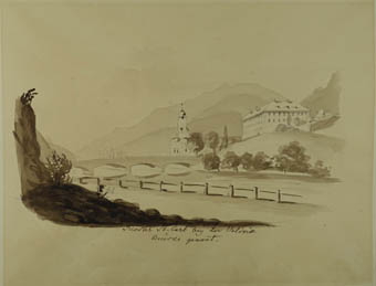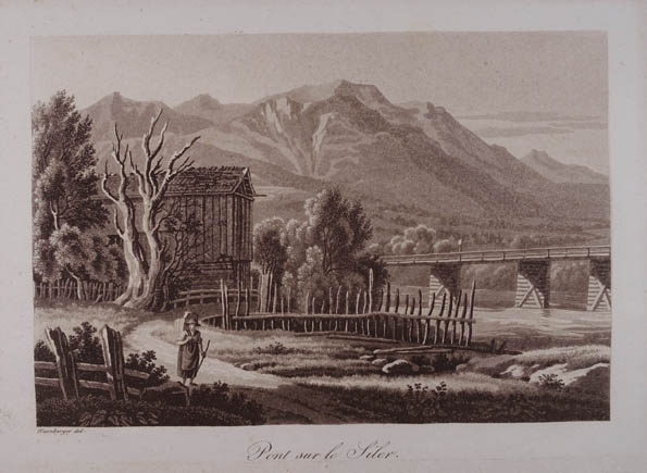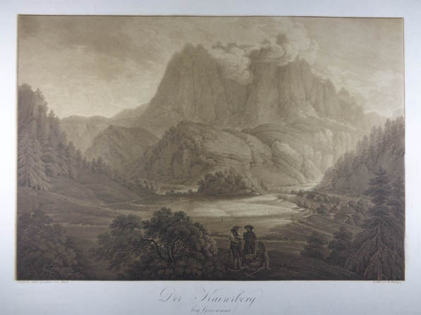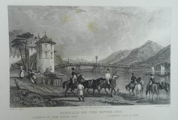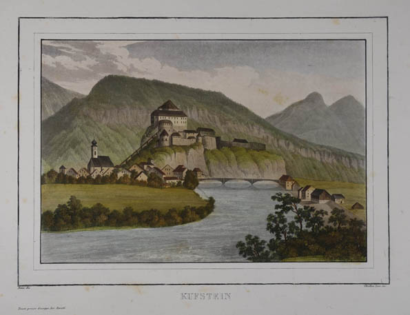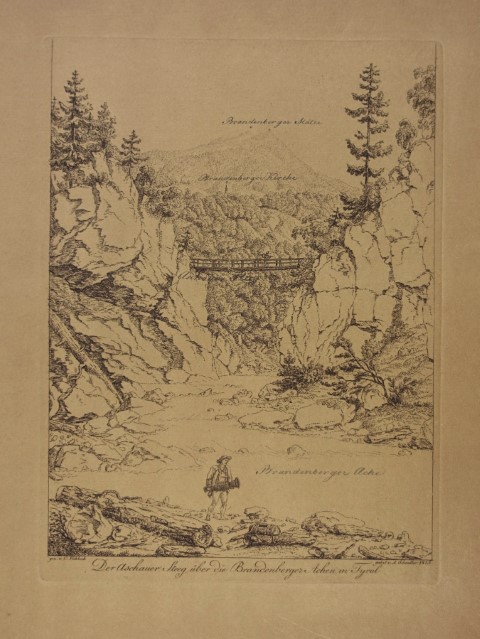 Der Aschauer Steeg über die Brandenberger Achen in Tyrol. Umrissradierung v. A. Schindler nach C. Viehbeck aus "Mahlerische Reise durch die schönsten Alpengegenden des Österreichischen Kaiserstaates", Wien 1821, 23,5 x 18,5 cmNebehay-W. 778 / 44.- Selten, die Radierung wurde bereits 1815 gemacht.- Auf bräunlichem Papier mit Beschriftung der wichtigsten Orte.- Im Hintergrund die Kirche von Brandenburg.- Karl Ludwig Friedrich Viehbeck (1769-1827) vollendete 1820 einen "Cyclus Aquarelle, welche Ansichten malerischer Gegenden im österreichischen Kaiserstaate darstellten ... und von berühmten Wiener Künstlern in Kupfer radirt" (Wurzbach L, 275) wurden.- Gebräunt. (Tyrol, Tirol) |