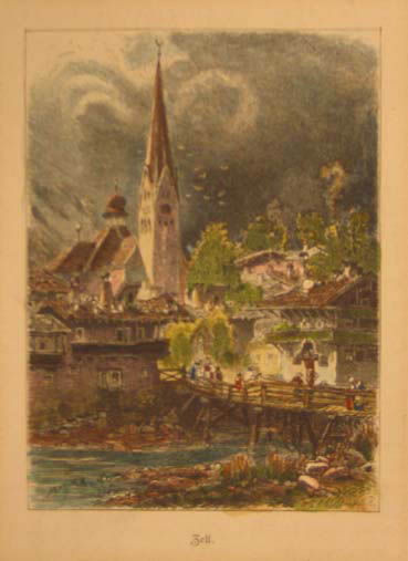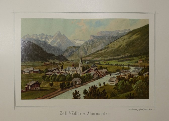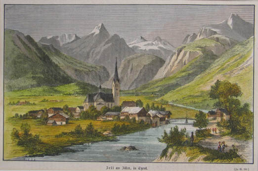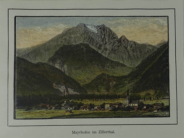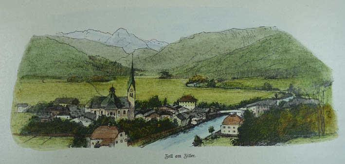 Zell am Ziller. Kolorierter Holzstich 1896, 7 x 17 cm(Zillertal, Tyrol, Tirol) |