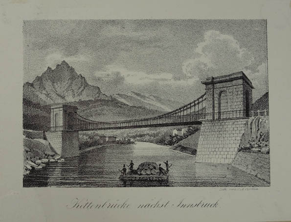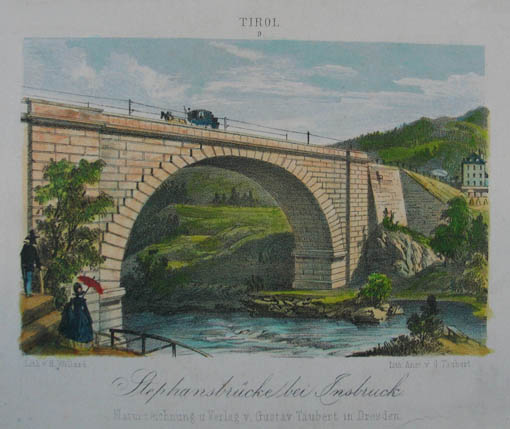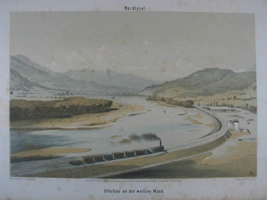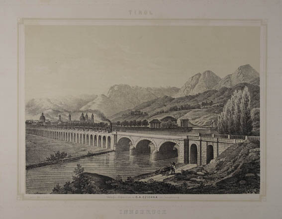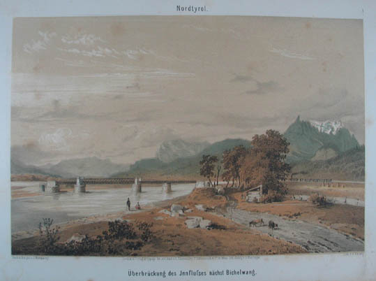 Überbrückung des Innflusses nächst Bichelwang. Tonlithographie v. Kaiser n. Novopacky aus "Zur Erinnerung an die Eröffnung der Eisenbahnstrecke von Innsbruck n. Kufstein" Wien 1858, 17 x 25 cmNebehay-W. 864 / 2.- Johann Novopacky (* 15.11.1821 Nechanitz/ Nechanice (Böhmen), 3.7.1908 Wien) studierte an der Wiener Akademie der bildenden Künste bei Thomas Ender und Franz Steinfeld. Er war Zeichenlehrer am kaiserlichen Hof, daneben arbeitete er auch als Radierer und Lithograph. Der Künstler unternahm mehrere Reisen nach Tirol, Italien, Istrien, Dalmatien und Ungarn. Viele seiner Landschaftsbilder sind auf diesen Reisen entstanden.- leicht fleckig (Eisenbahn, railroad, Tyrol, Tirol) |