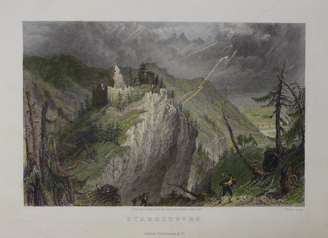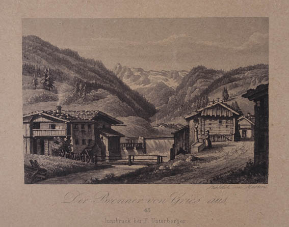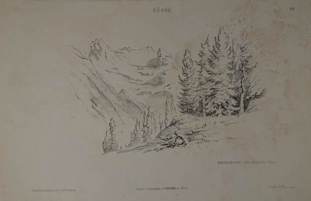 Am Brenner. Lithographie aus "Landschafts-Schule" von Joseph Höger (1801-1877). Wien, F. Paterno um 1850, 17 x 26 cm (Blattgr.)Nr. 117.- Nicht in Nebehay-W., selten.- Entworfen u. lithografiert von Joseph Höger (1801-1877). Er war österreichischer Landschaftsmaler, Aquarellist, Radierer und Lithograf. 1843 wurde er Professor an der Wiener Akademie, an der er auch studiert hatte. Bekannt ist er wegen seiner stimmungsvollen und zugleich auch dramatischen Wald- und Gebirgslandschaften, aber auch durch seine feinen und detailgetreuen Aquarelle. Deshalb wurde ihm im Freundeskreis scherzhaft der Spitzname "Bäume-Raffael" verliehen. Viele seiner Blätter dienten aus diesem Grund als Vorlagen für Lithographien. - Leicht braunfleckig. (Tyrol, Tirol) |