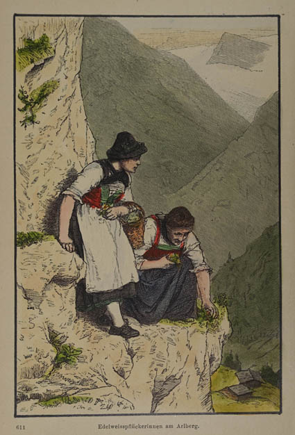 Edelweisspflückerinnen am Arlberg. Kolorierter Holzstich um 1890, 15 x 10 cm(Bergsteigen, Trachten, Tyrol, Tirol) |