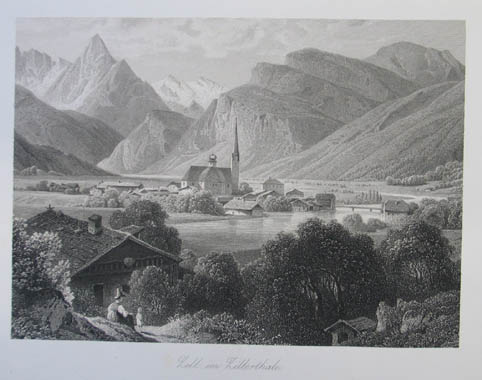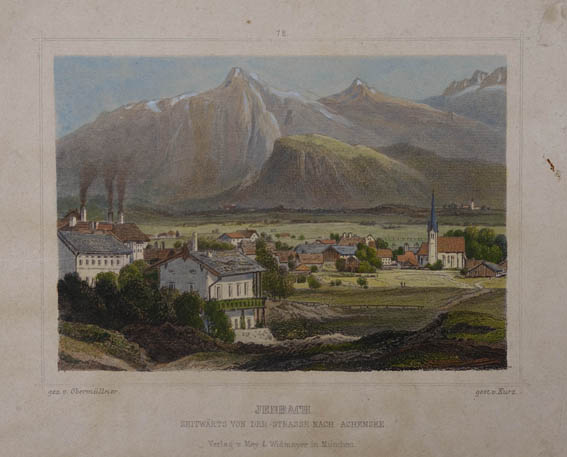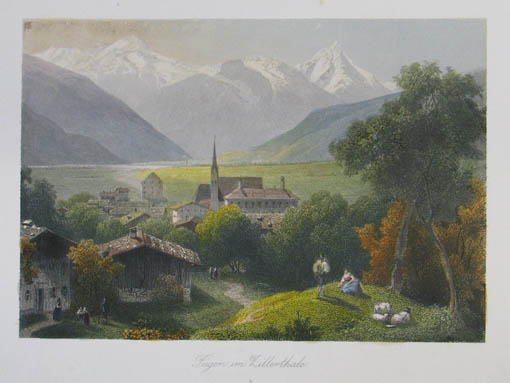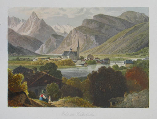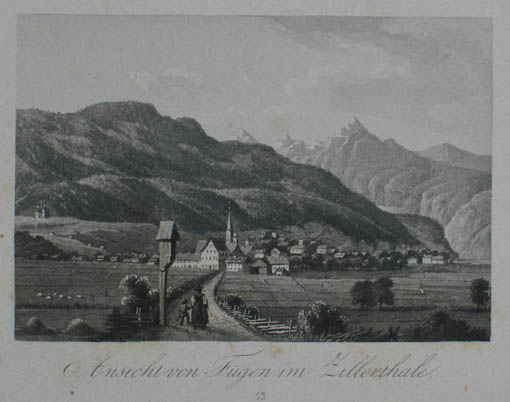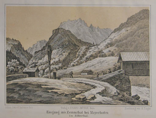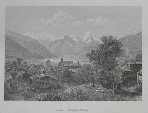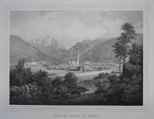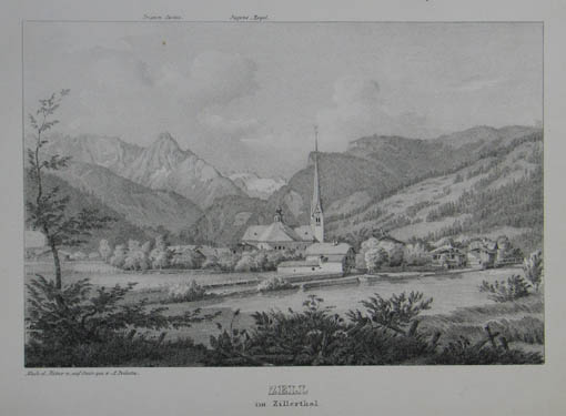 Nicht in Nebehay-W.- Seltene, großformatige Lithographie.- Johann Wölfle (geb. 1807 in Ebersbach an der Fils, gest. 1893 in Faurndau) arbeitete als Lithograph und Zeichner und fertigte zahlreiche Ansichten von Städten, Dörfern und sonstigen Sehenswürdigkeiten an. (Zillertal, Tyrol, Tirol) |