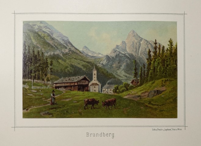 Brandberg. Chromolithographie aus Gerasch "Die österreichische Gebirgswelt” Graz 1887-94, 9,5 x 15,5 cmNebehay-W. 195 / 113.- Älteste gedruckte Ortsansicht ! August Gerasch (* 1. September 1822 Wien; 23. März 1908 ebenda) war Landschafts- und Genremaler.- (Zillertal, Tyrol, Tirol) |