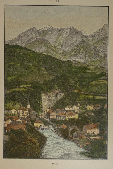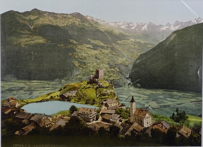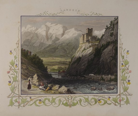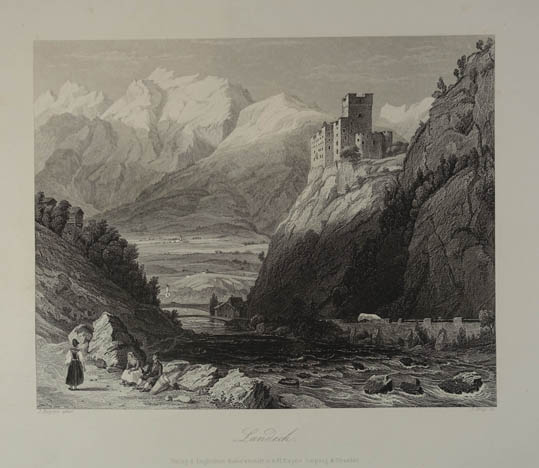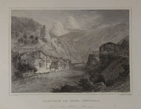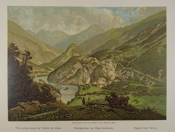 Thalsporne im Ober-Innthale. Vue prise dans le Vallée de l Inn. Upper Inn Valley. Chromolithographie aus "Geographische Charakterbilder” Hölzel Wien um 1880, 14,5 x 20 cmNicht in Nebehay-W.- Blick von erhöhtem Standpunkt auf das Inntal mit Zams u. Burg Kronburg. |