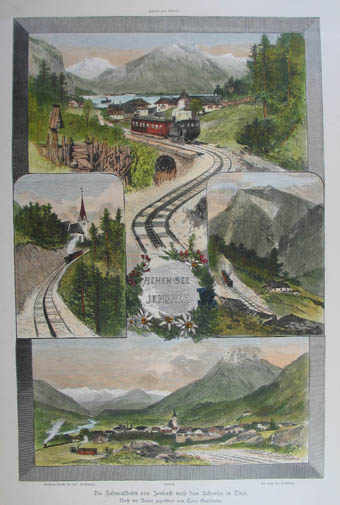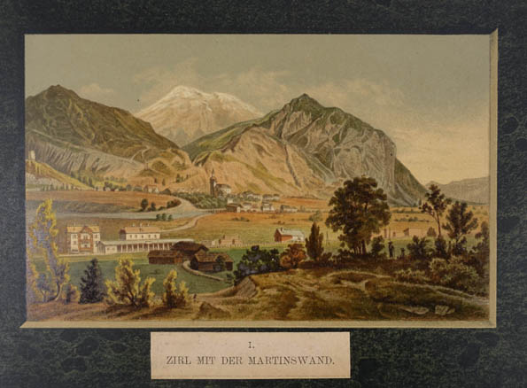 Zirl mit der Martinswand. Chromolithographie nach einem Aquarell von Ferdinand Gatt, aus "Arlberg-Album” Wien 1886, 10 x 16 cmNebehay-W. 7 / 1.- Arlbergbahn.- Mit Titelschild (Eisenbahn, railroad, Tyrol, Tirol) |