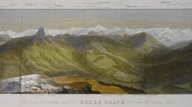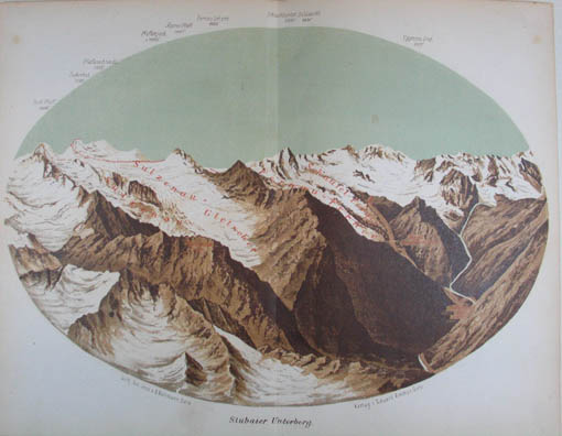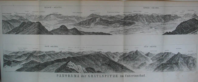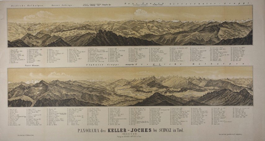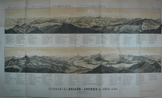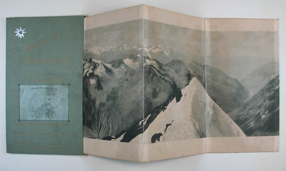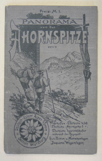 Panorama von der Ahornspitze 2971 m. Mehrf. gef. Autotypie. Deutsch-österr. Alpen-Verein Section Würzburg (um 1900). 17,5 x 184 cm, in illustr. OLwd.(Zillertal, Panorama, Gebirgspanorama, Alpinismus, Tyrol, Tirol) |