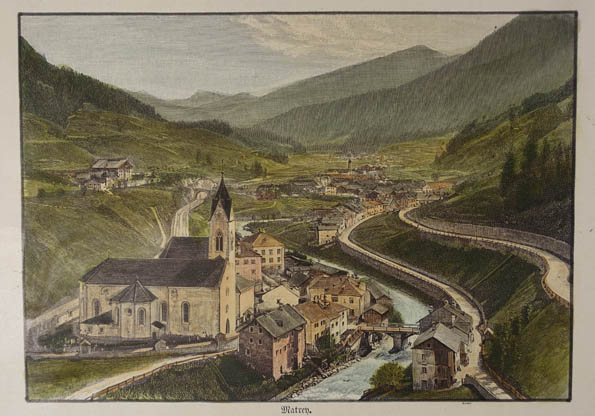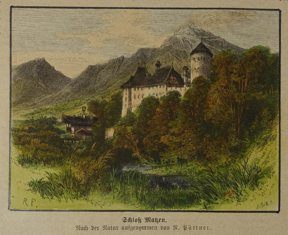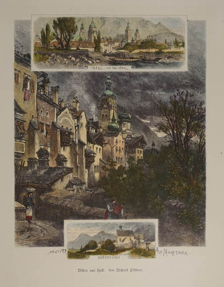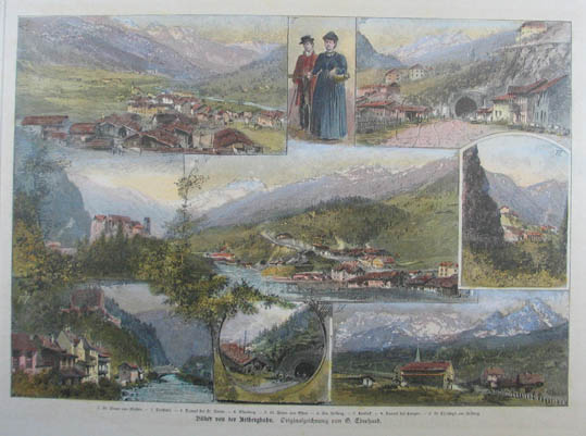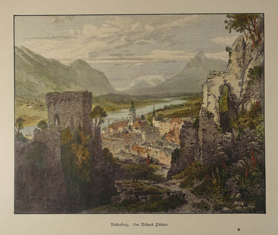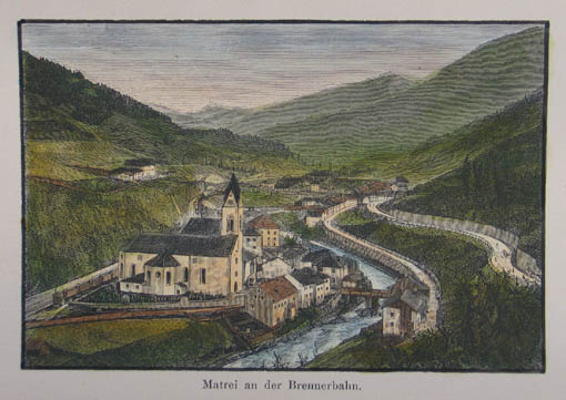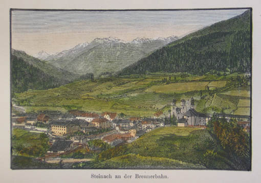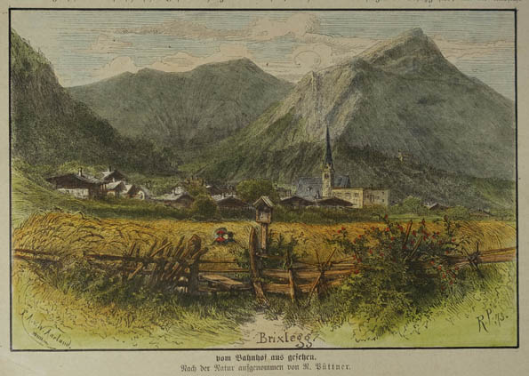 Brixlegg vom Bahnhof aus gesehen. Kolorierter Holzstich von W. Aarland nach Richard Püttner, 1873, 12,5 x 18,7 cmDer Illustrator und Zeichner Richard Püttner (* 1. Januar 1842 in Wurzen; 1. November 1913 in München) war u. a. für Die Gartenlaube, Daheim, Illustrirte Zeitung und Über Land und Meer tätig, und illustrierte auch Prachtwerke.- (Tyrol, Tirol) |