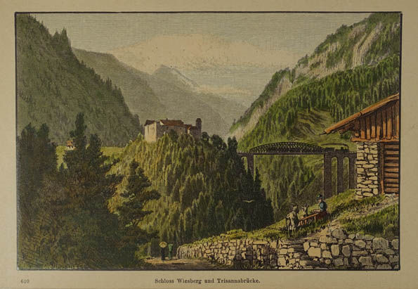 Schloss Wiesberg und Trisannabrücke. Kolorierter Holzstich um 1880, 10 x 15 cmArlbergbahn (Tyrol, Tirol) |