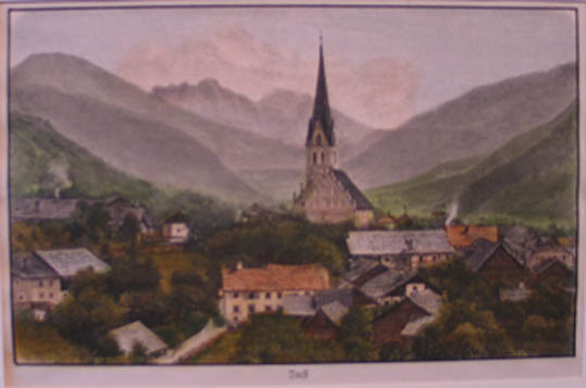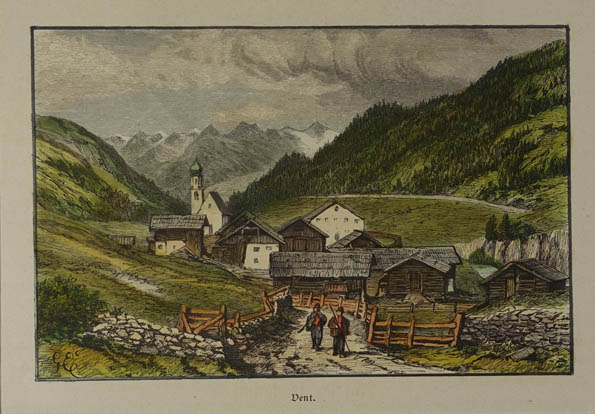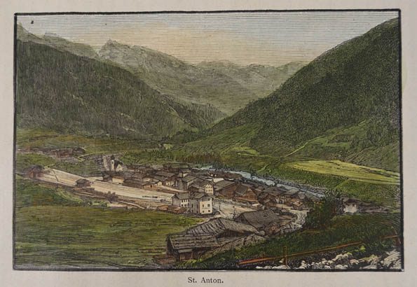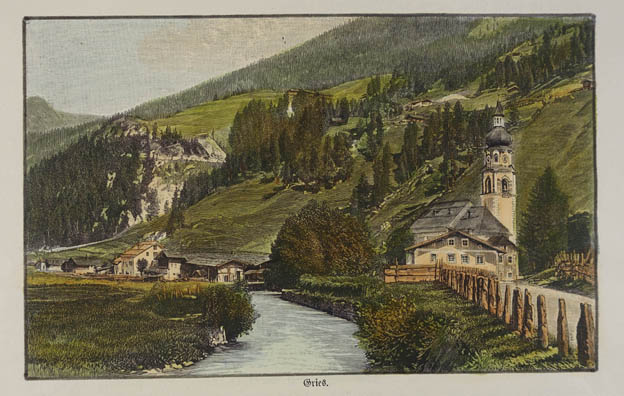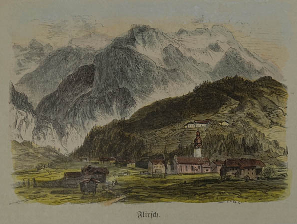 Flirsch. Kolorierter Holzstich um 1880, 7 x 10,5 cmHübsche kl. Ortsansicht von Flirsch im Stanzertal, in den Bergen zwischen Landeck und dem Arlbergpass gelegen. (Stanzertal, Tyrol, Tirol) |