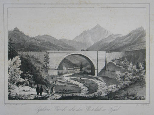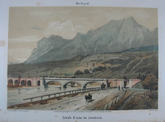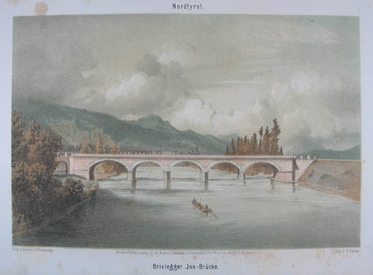 Brixlegger Inn-Brücke. Tonlithographie v. Kaiser n. Novopacky aus "Zur Erinnerung an die Eröffnung der Eisenbahnstrecke von Innsbruck n. Kufstein" Wien 1858, 16,5 x 25 cmNebehay-W. 864 / 6.- Johann Novopacky (* 15.11.1821 Nechanitz/ Nechanice (Böhmen), 3.7.1908 Wien) studierte an der Wiener Akademie der bildenden Künste bei Thomas Ender und Franz Steinfeld. Er war Zeichenlehrer am kaiserlichen Hof, daneben arbeitete er auch als Radierer und Lithograph. Der Künstler unternahm mehrere Reisen nach Tirol, Italien, Istrien, Dalmatien und Ungarn. Viele seiner Landschaftsbilder sind auf diesen Reisen entstanden. (Eisenbahn, railroad, Tyrol, Tirol) |