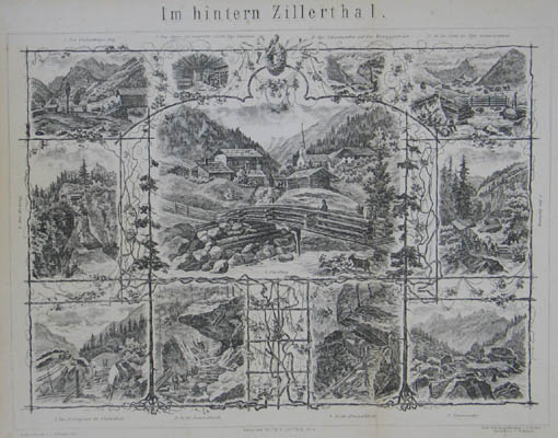 Nebehay-W. 880 / 13.- Sammelblatt mit 11 Ansichten: zeigt in der Mitte die Ortschaft Ginzling umgeben von Landschaftsansichten aus dem hinteren Zillertal (Der Finkenberger Steg, Das Innere der Sennhütte auf der Alpe Schwemm, Alpe Schwarzenstein mit dem Waxegggletscher, In der Nähe der Alpe Schwarzenstein, Der Hochsteg, Der Karlssteg, Der Hintergrund des Floithenthals, In der Zemmschlucht (2x), Bärenaualpe. - Alte Faltstellen geglättet. (Zillertal, Tyrol, Tirol) |
