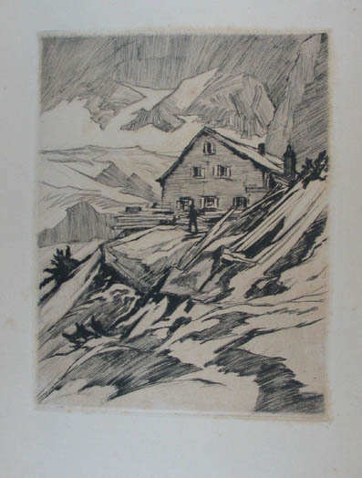 Coburgerhütte (Tirol) im Winter. Originalradierung v. Theo Blum, Wien, Verlag der Gesellschaft f. vervielfältigende Kunst 1929, 22 x 17 cmBlum Theo, Deutscher Landschaftsmaler, Radierer und Gebrauchsgraphiker. (1883 - 1967). (Alpinismus, Tyrol, Tirol) |