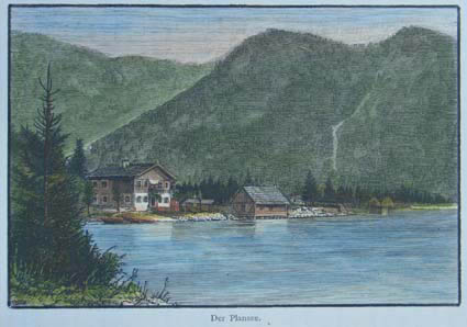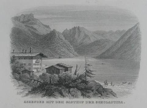Achensee mit dem Gasthof der Scholastika. Stahlstich v. J. Poppel aus "Das Königreich Bayern seine Denkwürdigkeiten und Schönheiten" München, G. Franz um 1870, 7,5 x 10,5 cm(Tyrol, Tirol) |